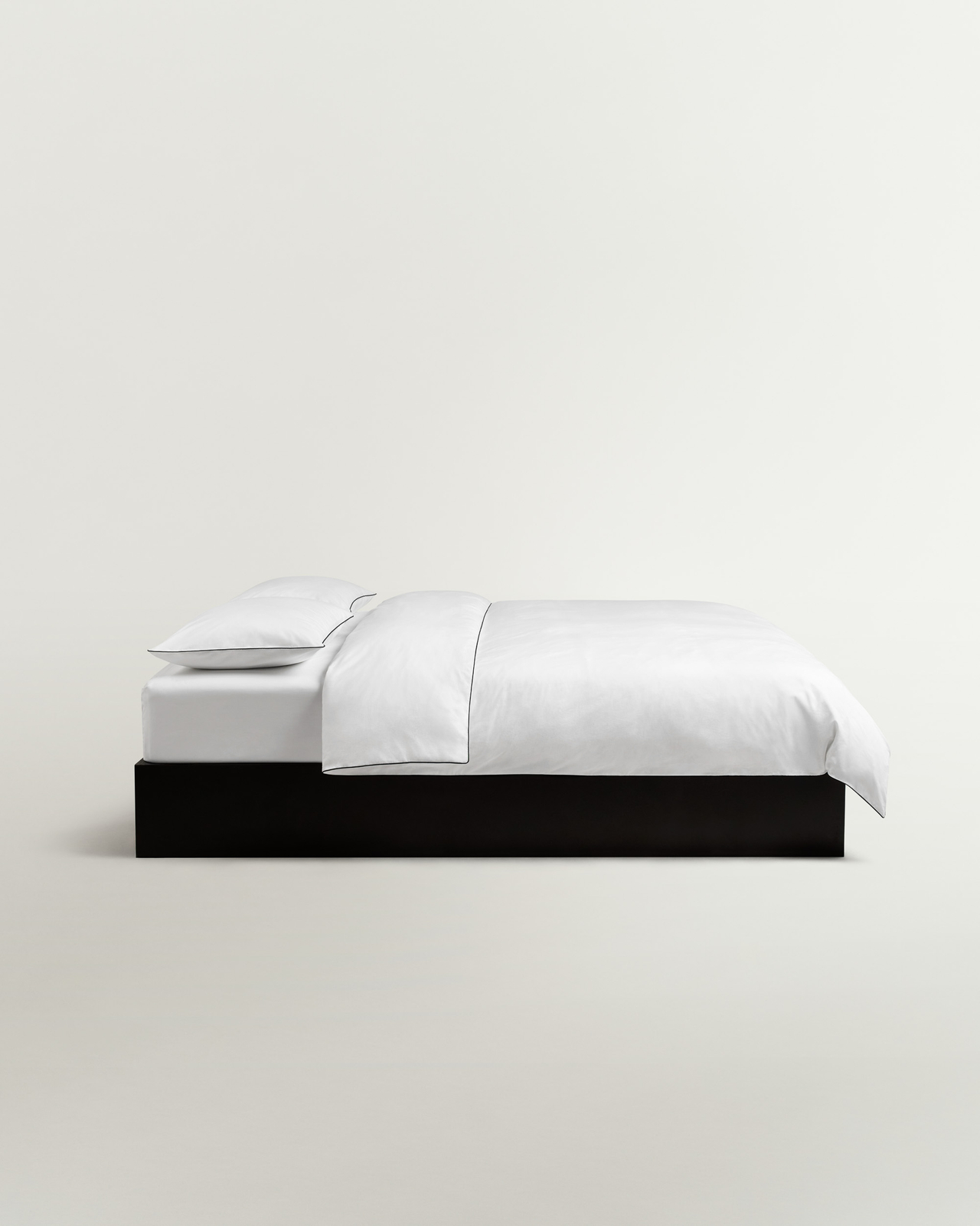 Percale Bettbezug-Set in Crisp White/Black, auf einem Bett arrangiert, aus weißer Baumwollperkal mit feiner schwarzer Paspelierung für einen klaren, grafischen Look.