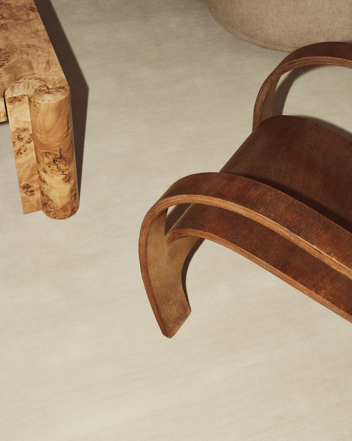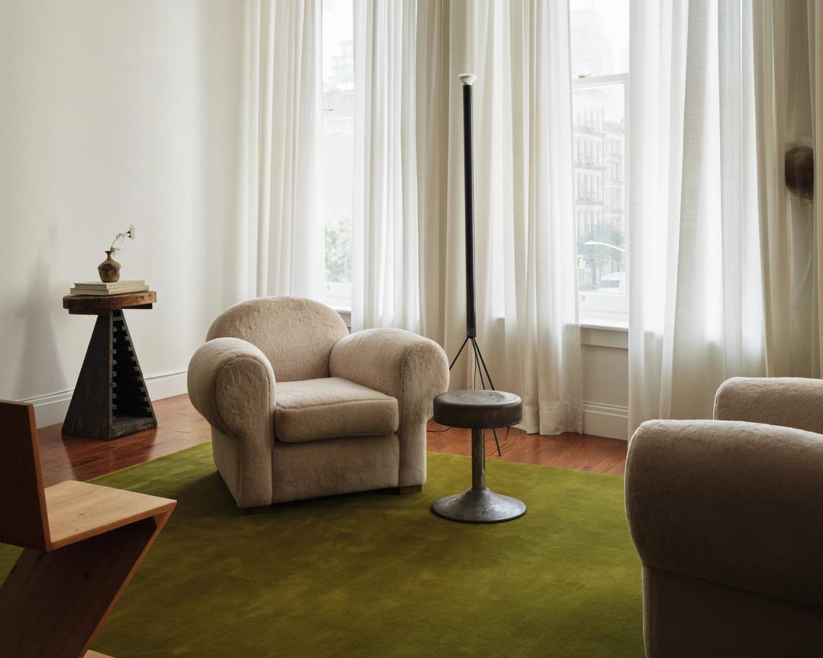 Der flauschige Wollteppich Grand in Lilac wird in einem kurzen Videoclip gezeigt, unter einem kleinen Holzcouchtisch und einem hellgrauen Sofa in einem modernen Wohnzimmer in Stockholm, Schweden.