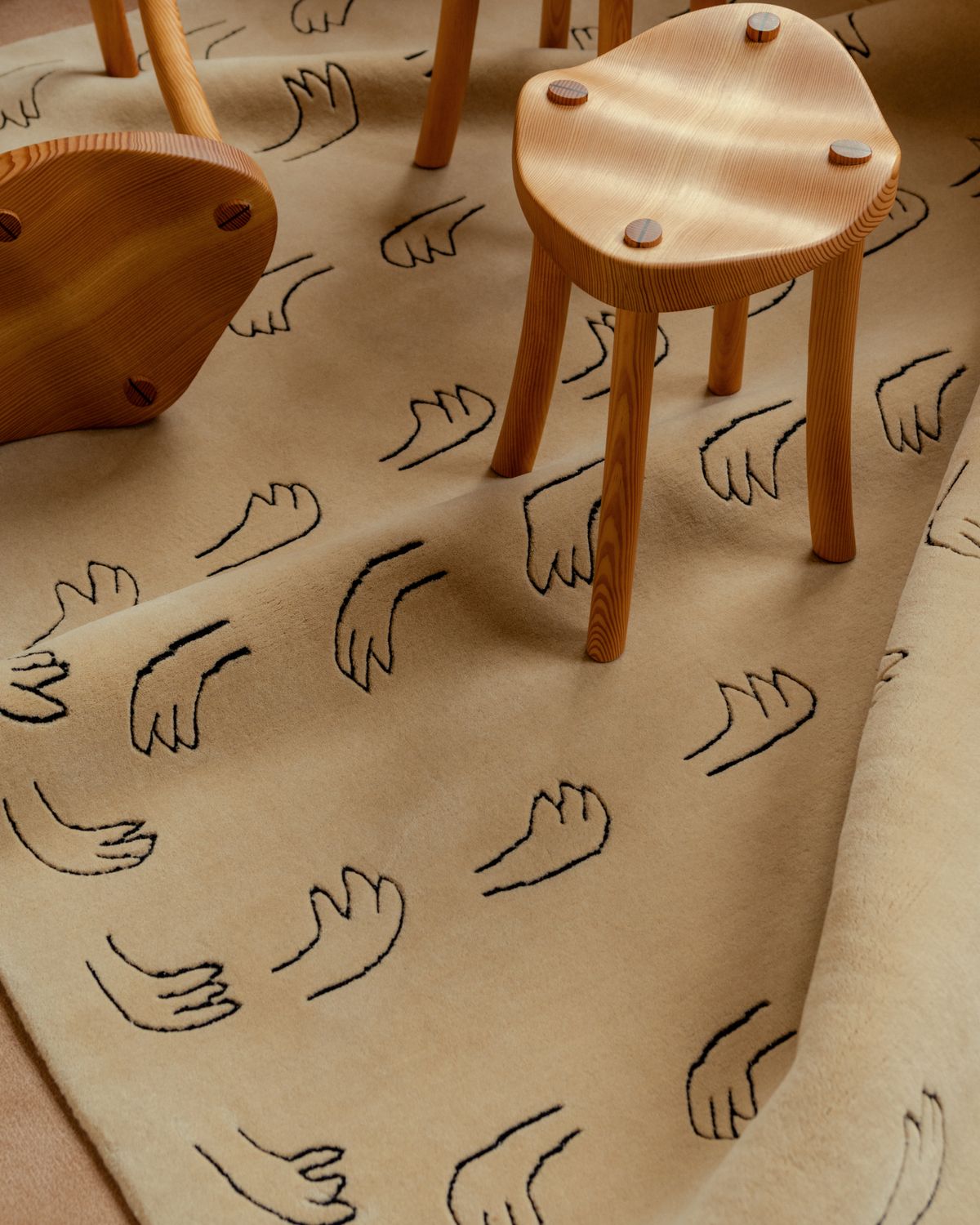 Im Kontrast dazu stehen die handgezeichneten Motive des renommierten Architekten Giancarlo Valle. Verbranntes Rot, Flachsgelb, Waldgrün und cremefarbenes Beige: angelehnt an die nordische Folklore. Jeder Teppich steht in emotionaler Verbindung zur Farbe und im Dialog mit den Erinnerungen des Künstlers.