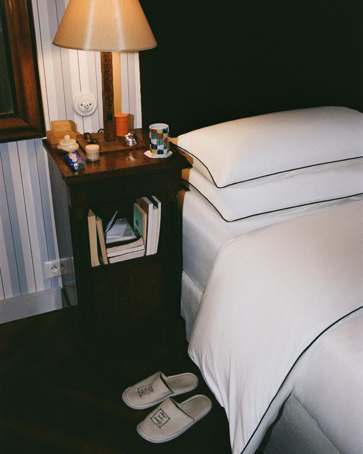 Bartlett’s home is more about mood than perfection. The bedroom, lined with striped wallpaper and anchored by crisp percale, hums with quiet rhythm. Light filters in from the street, falling across checkerboard wool and the amber glow of bedside lamps.
