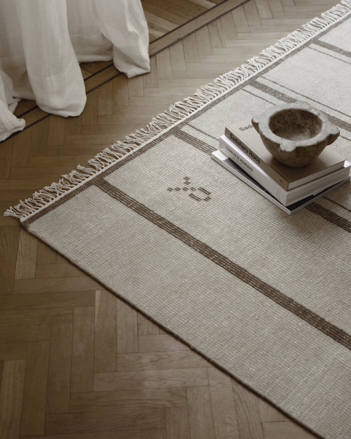 Un tapis de laine à tissage plat qui ne ressemble à aucun autre. Fabriqué à la main par des artisans tisserands avec une laine mérinos naturelle non teintée - notre fibre la plus douce et de la plus haute qualité. Il s'agit d'un design austère, mais avec beaucoup d'attention aux détails.
