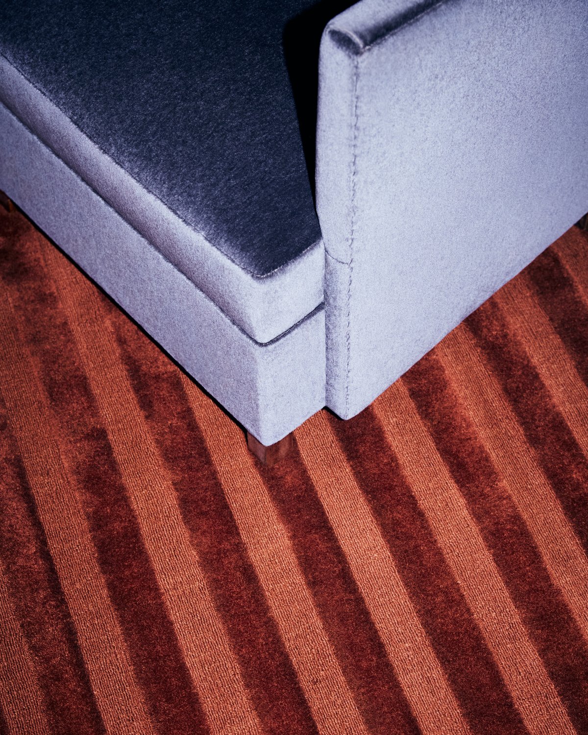 Le tapis en laine moelleux et texturé Park dans la teinte Rose est présenté dans un court clip vidéo, placé sous un canapé rouge et une table basse en bois à Stockholm, en Suède. La vidéo montre également le tapis en gros plan, offrant une bonne perception de sa douceur.