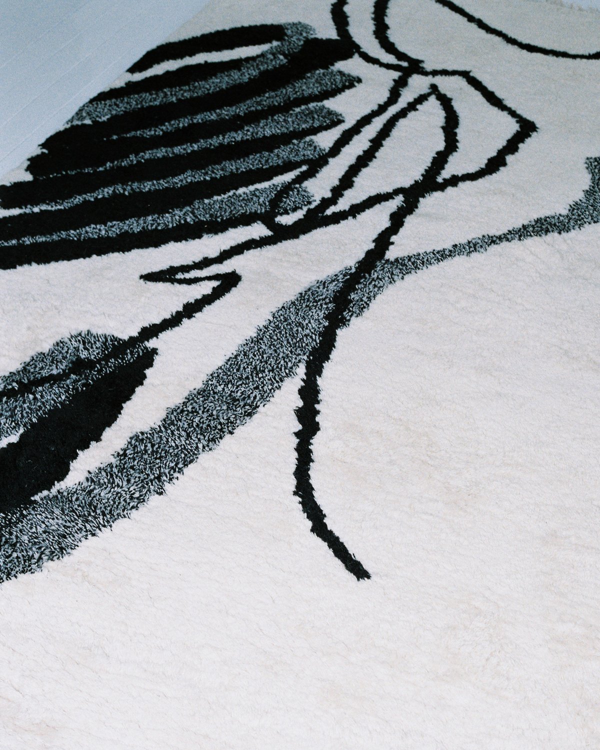 Genom monokromatiska lager och rytmiska penseldrag återskapar konstnären Aythamy Armas sina signaturverk på en handknuten duk i nyzeeländsk ull av högsta kvalitet.