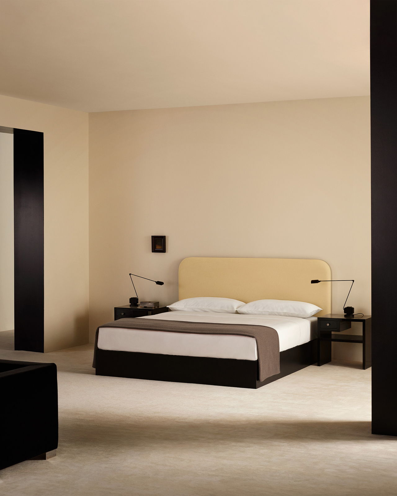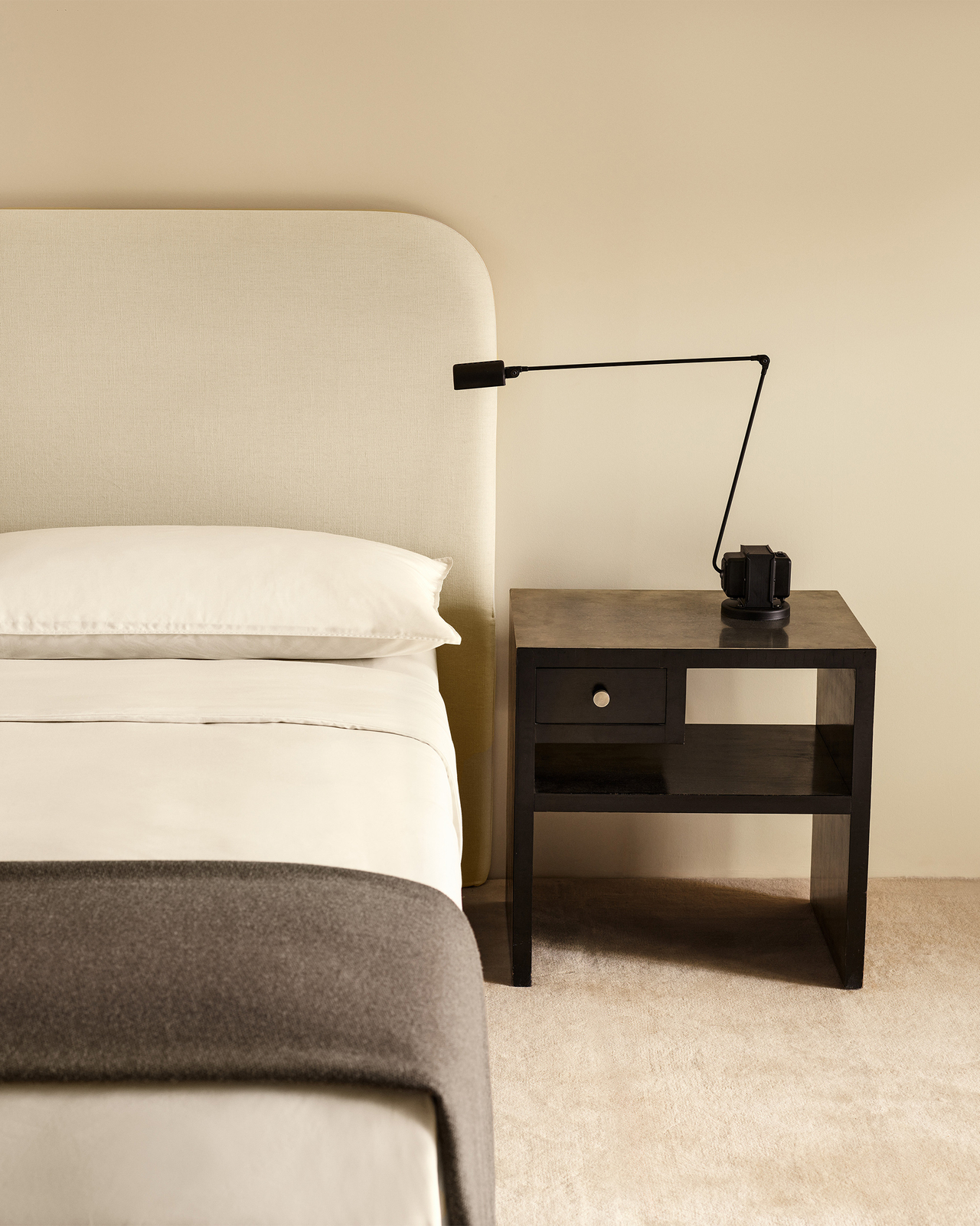 Offering a sculptural presence that adds movement without disruption. Its quiet, romantic form enhances any bed style or height, resting effortlessly on the floor.