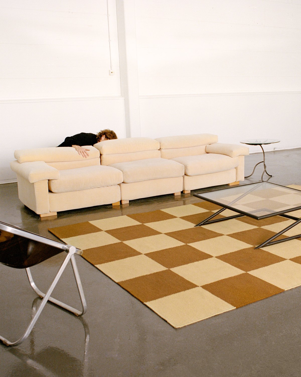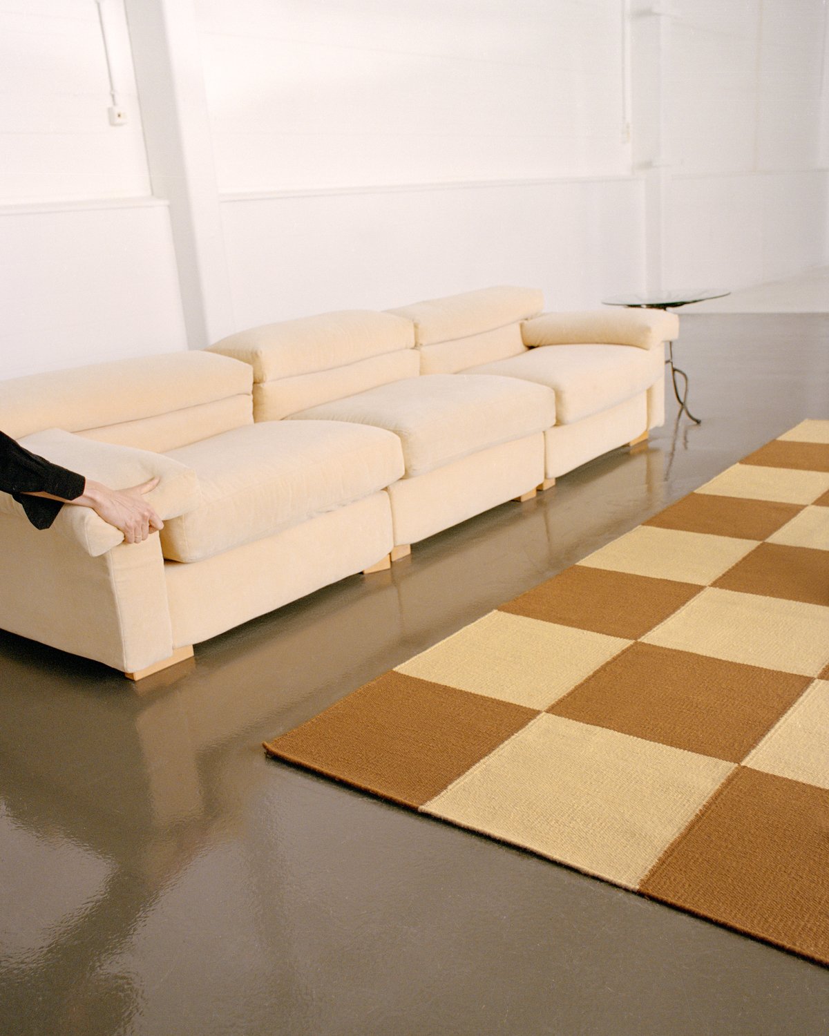 A short video clip features the rug Square in Black/Cream in a warehouse, where the rug sits underneath a white coffee table as a person picks some trash from the table.