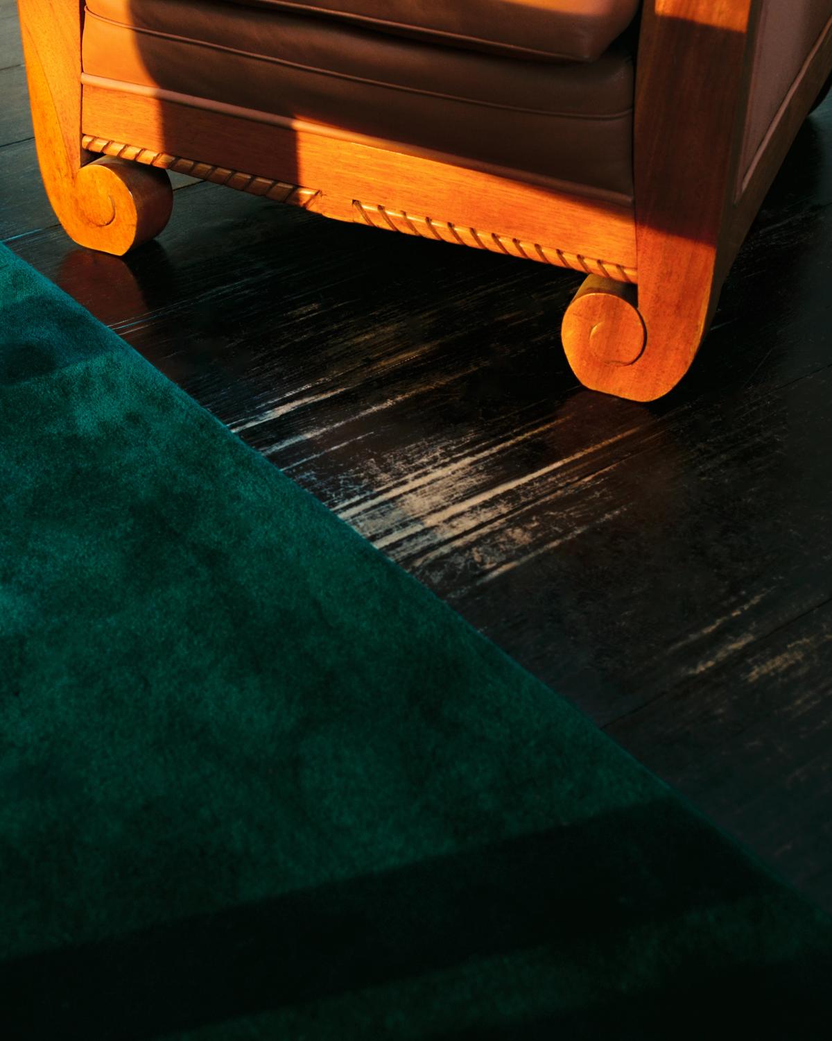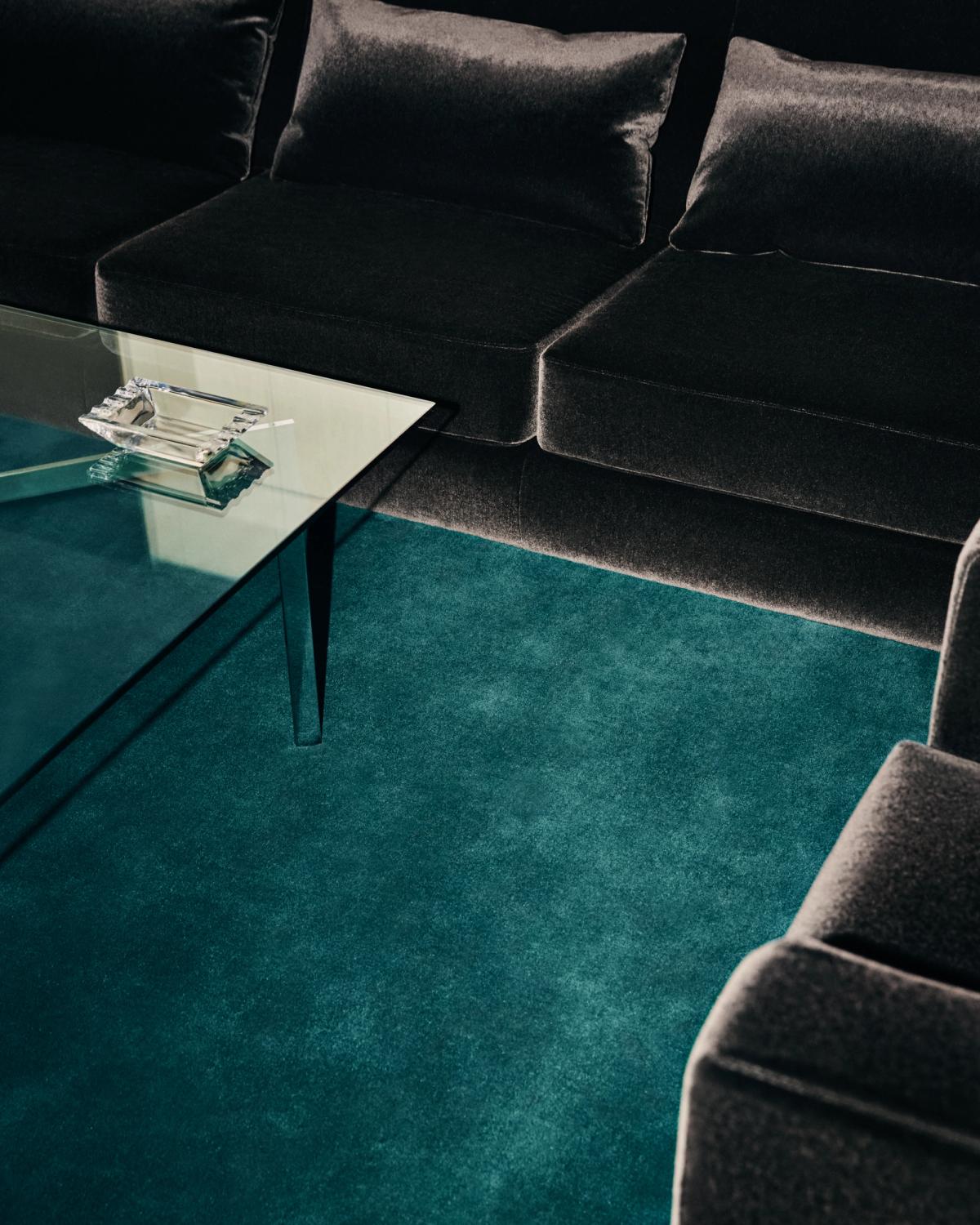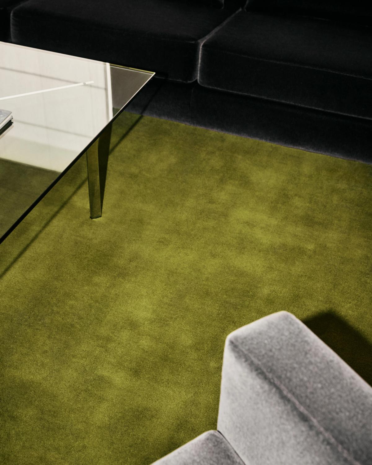 Wide in-room shot of the Grand rug in Emerald Green, grounding a black sofa and glass coffee table in a calm, minimal living space.