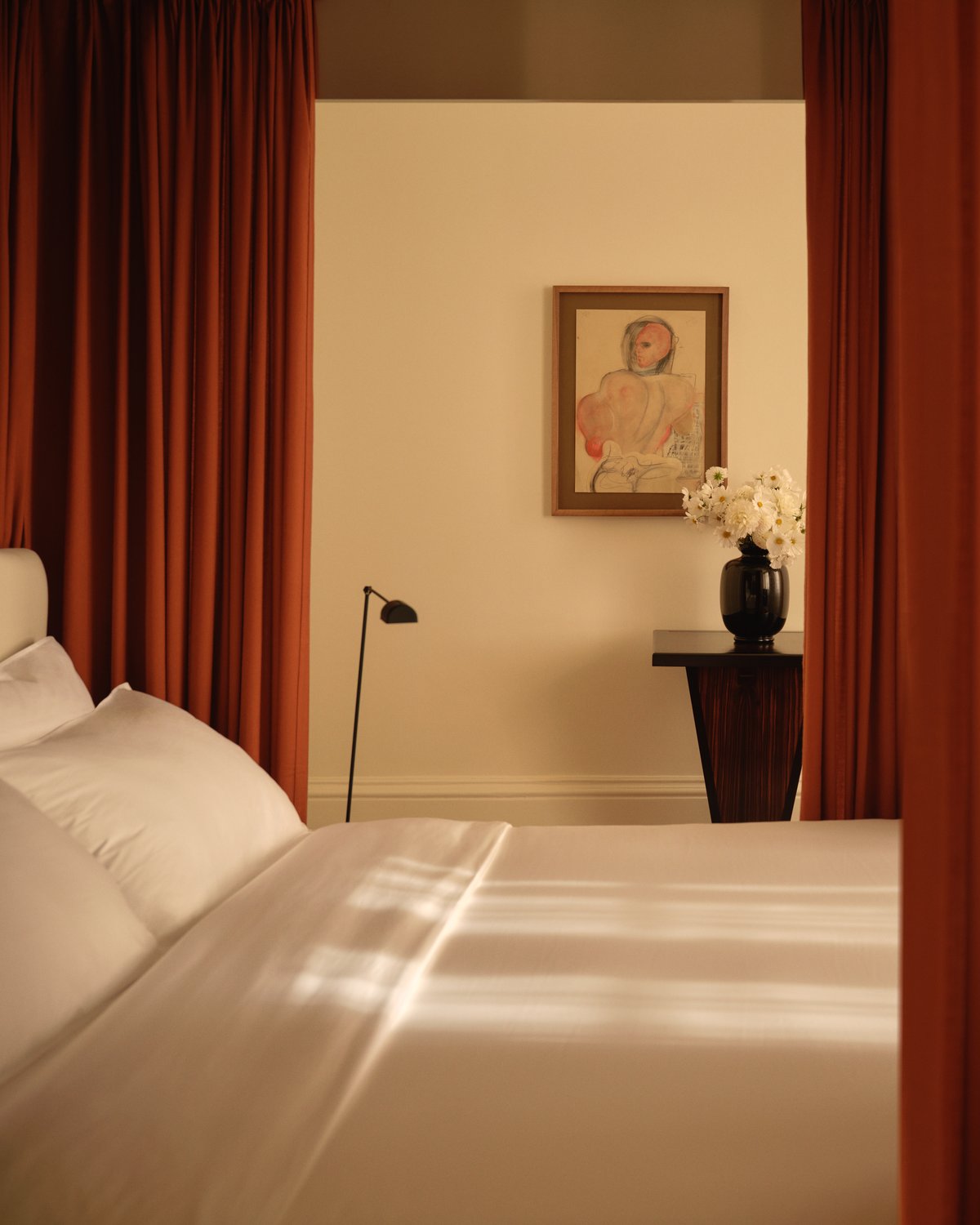 A bespoke stainless steel bed, wrapped in The Grand Burnt Red curtains, forms the striking centerpiece of the bedroom. Its clean lines are softened by Crisp White Sateen bedding, giving the space a look that’s both sculptural and serene.
