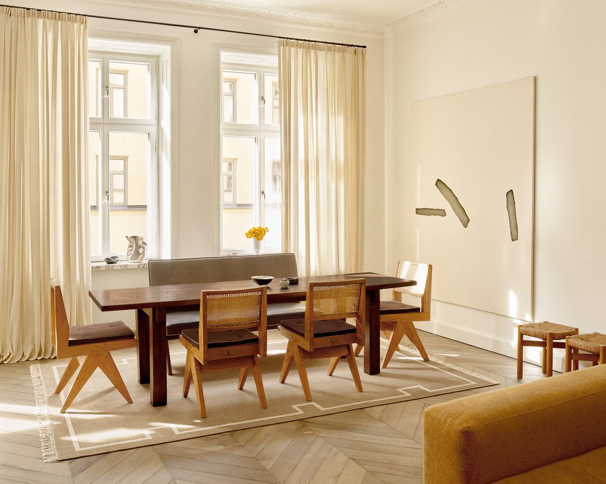 The Elder 05 rug in Cream is shown in a modern living room with a curved mustard sofa, wooden coffee tables, and a geometric floor lamp, creating a warm and minimal atmosphere.