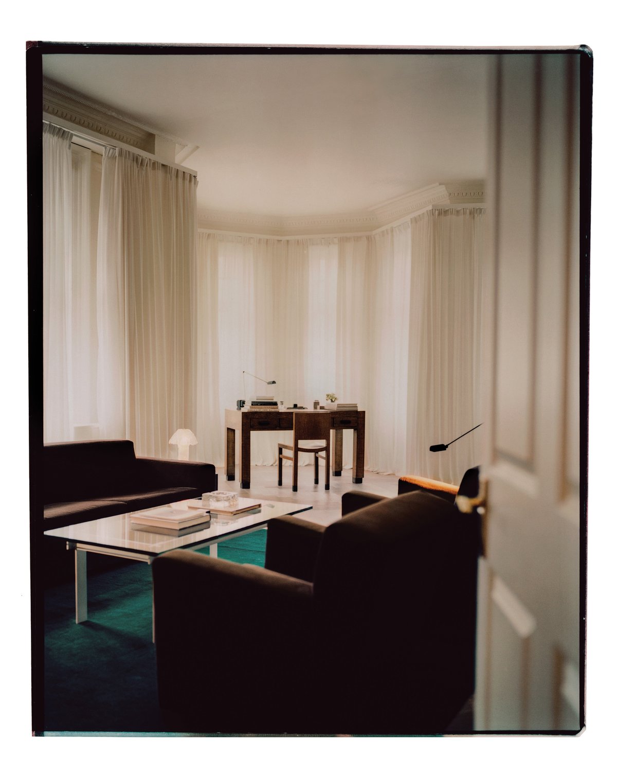 Emerald green meets deep walnut, balanced by glass and sculptural lighting. White curtains complete the room.