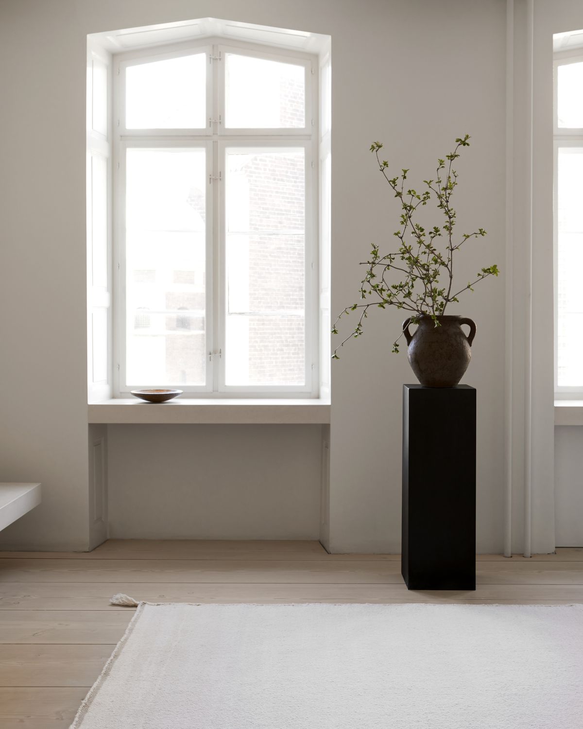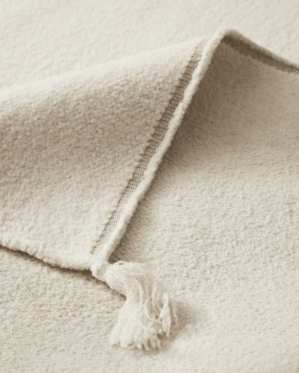 The natural merino yarn has a dusty warm shade of white that will beautifully complement other natural materials such as wood, stone and concrete. It’s an austere design but with a lot of attention to the details. The elegant trimmed edge and the tied up merino fringes in each corner gives it a Scandi-Bohemian aesthetic that makes it; simply a statement.